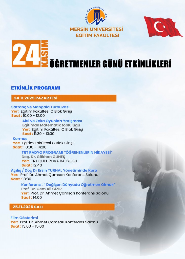 Eğitim Fakültesi’nde “Cumhuriyet’in 100. Yılında 24 Kasım Öğretmenler Günü Etkinlikleri” kapsamında İçel Sanat Kulübü, Mersin Yazarlar Derneği, Mersin Şairler ve Yazarlar Derneği ve Mersin Sanat Edebiyat Derneği tarafından “Mersinli Yazarlar Öğre