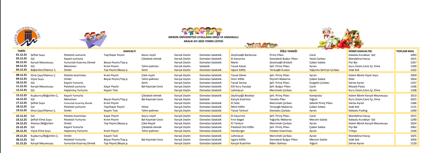Kreşler Aralık 2025 Yemek Listesi