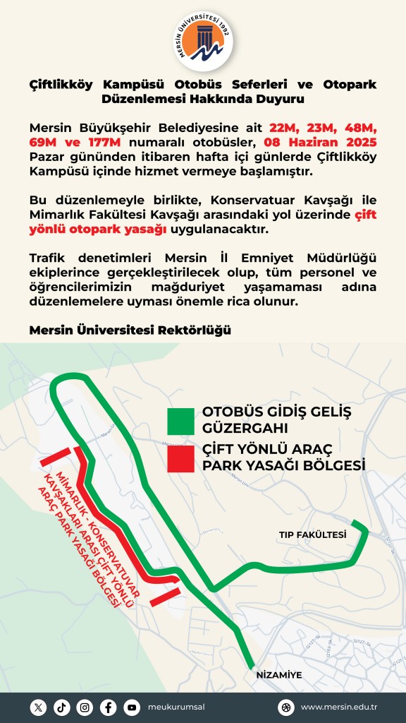 Üniversitemiz Çiftlikköy Kampüsü Otobüs Seferleri ve Otopark Düzenlemesi Hakkında Duyuru
