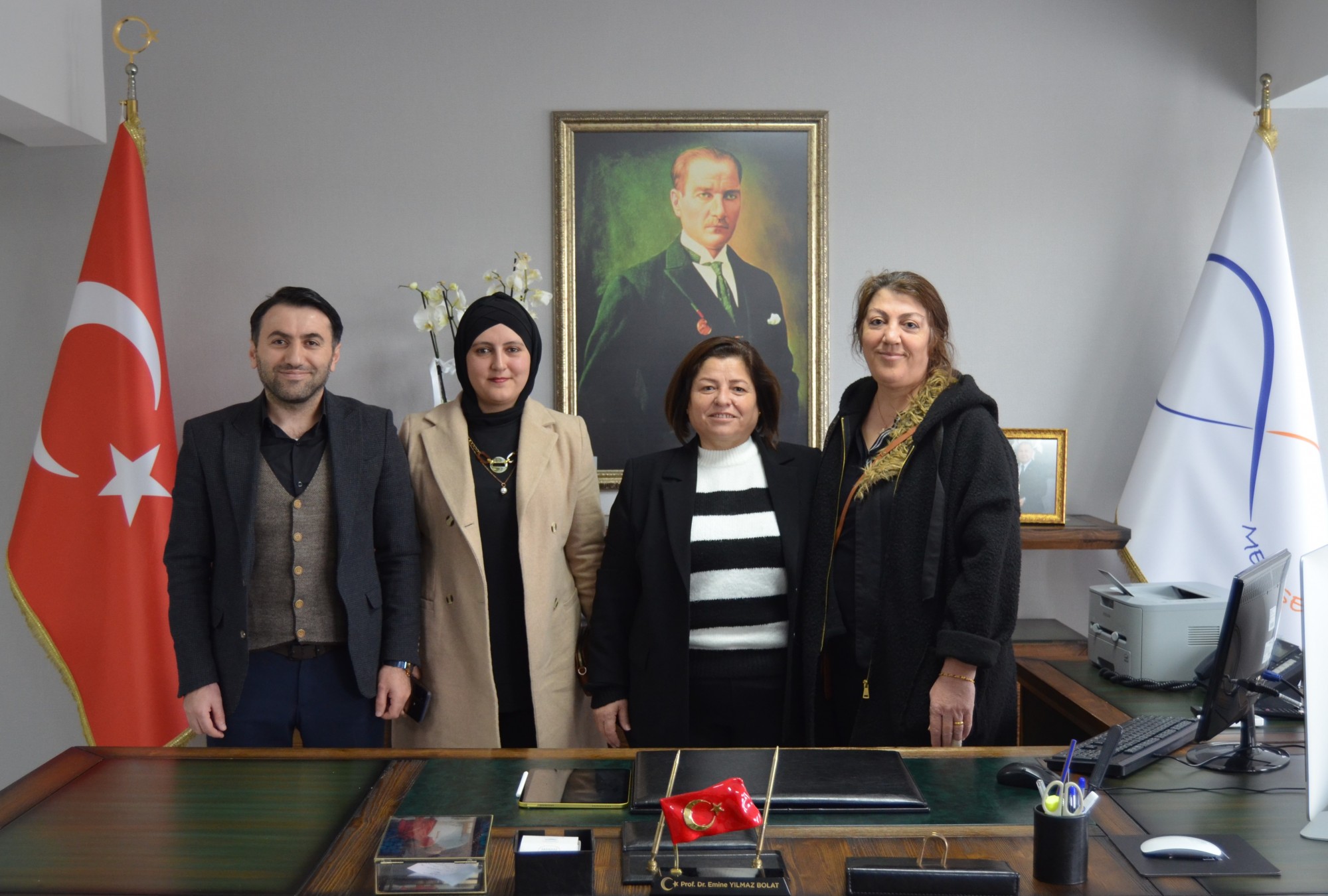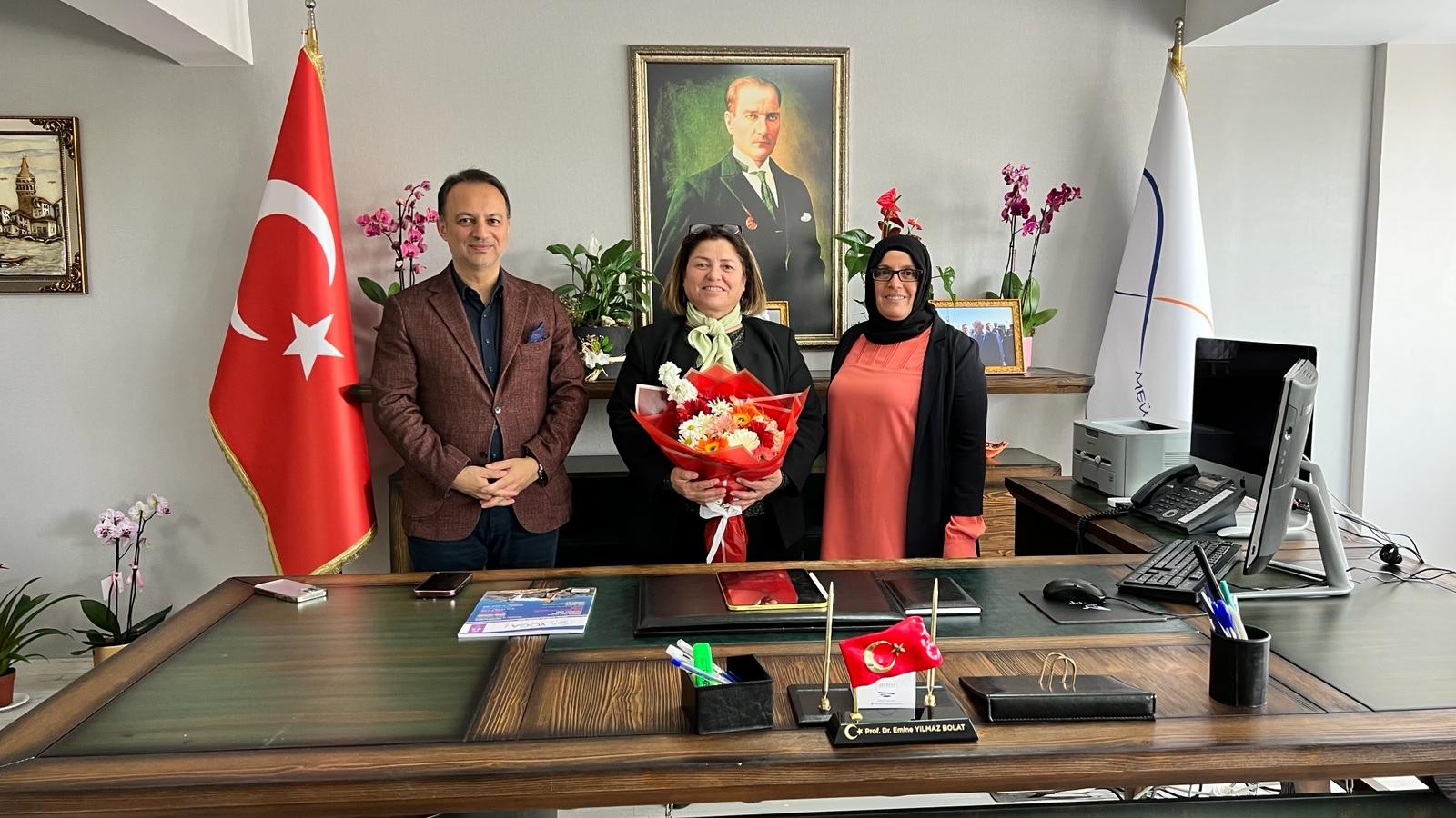 Merkez Müdürümüz Prof. Dr. Emine YILMAZ BOLAT'a Üniversitemiz Sağlık Hizmetleri Meslek Yüksekokulu yönetiminden, Meslek Yüksekokul Müdürü Prof. Dr. Duygu VEFİKULUÇAY YILMAZ, Müdür Yardımcıları Dr. Öğr. Üyesi Gül BAYRAM ve Öğr. Gör. İbrahim DUMAN